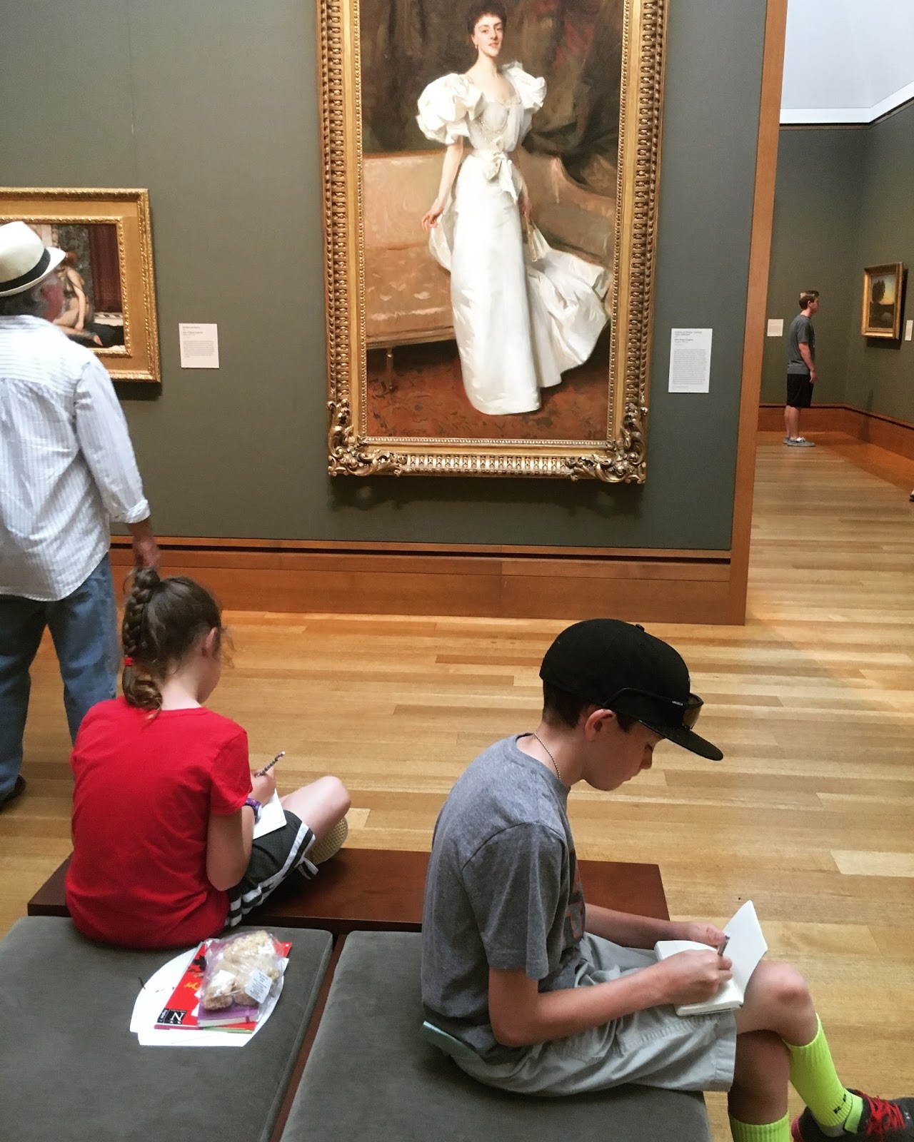 In an eleventh-hour moment of inspiration, I bought each of the kids a little sketch book, reasoning that they’d have a lot more fun engaging with great works of art instead of just admiring them. Several times throughout the day, they each picked a painting, parked themselves in front of it, and did their best to draw it in their little books in five minutes. If you’ve never done this before, the Getty has a great blog post about how to get started, and they even have several programs set up to encourage visitors to try their hand at this, including Drawing from the Masters, with professionals on hand for guidance, and Family Drawing Hour.