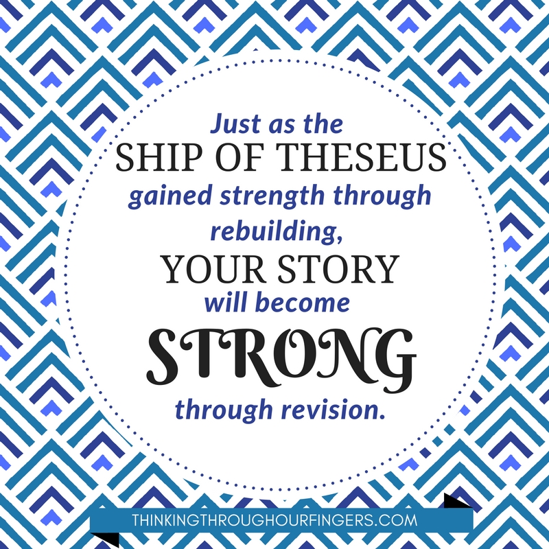 On the one hand, I was happy that my story was beginning to take on a new life, but on the other hand, I began to freak out a little. Every change necessitated another change, and I couldn’t escape the feeling that another piece of my original story was being lost forever. Was this new story still the same story? Was it still my story? Was I writing my own version of the Ship of Theseus?