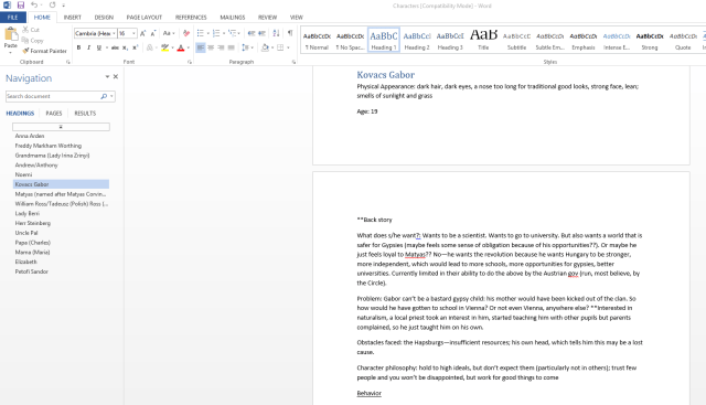 But that’s a pretty basic use for the headings. I use headings to organize my character file, which lets me move easily between characters (and if I wanted, I could customize these headings with subheadings for physical description, backstory, fears, guiding philosophy, etc.):