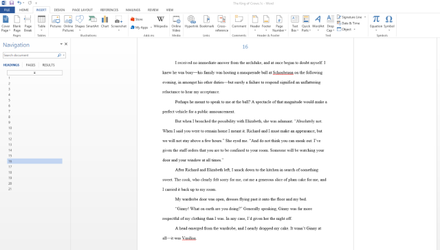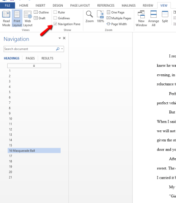 Did you know that Word has an option that lets you view chapter headings (all levels) in a sidebar on your computer? For instance, my current work-in-progress looks like this: I can see all of the chapters at a glance in the side bar, and if I need to move from one chapter to another, it’s relatively easy to find, instead of scrolling through the document or using the find function. You can also use descriptive titles to make finding a specific chapter even easier to find.