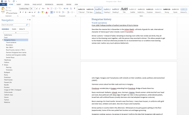 I also use headings (and subheadings) for my research notes, so that I don’t have to try and search 40+ pages. Using headings also makes it easy to figure out where to put new research notes. You’ll notice that under “Hungarian History” I have nested subtitles: Travel narratives, Revolution, War 1848-9, and more.
