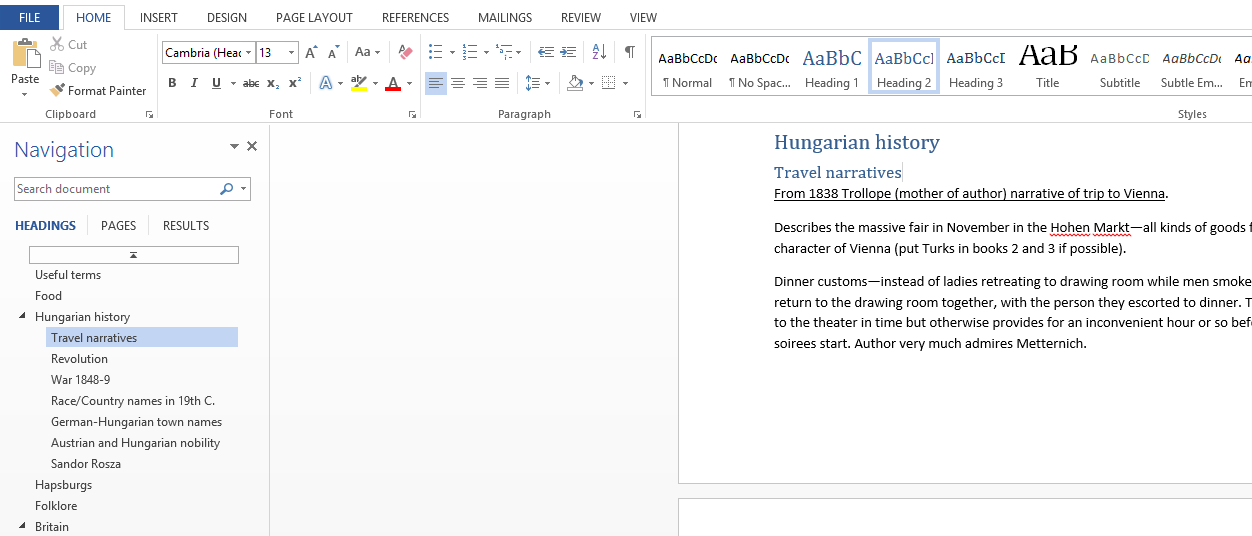 I also use headings (and subheadings) for my research notes, so that I don’t have to try and search 40+ pages. Using headings also makes it easy to figure out where to put new research notes. You’ll notice that under “Hungarian History” I have nested subtitles: Travel narratives, Revolution, War 1848-9, and more.