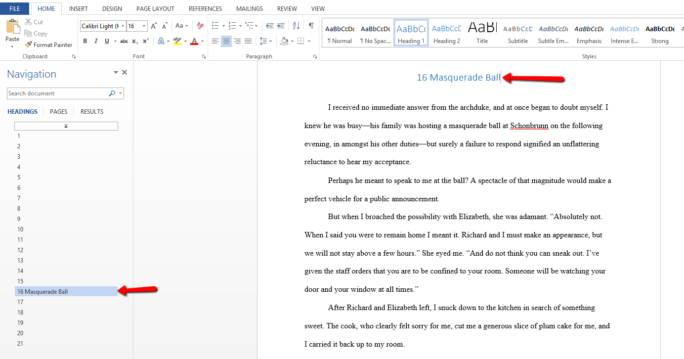 Did you know that Word has an option that lets you view chapter headings (all levels) in a sidebar on your computer? For instance, my current work-in-progress looks like this: I can see all of the chapters at a glance in the side bar, and if I need to move from one chapter to another, it’s relatively easy to find, instead of scrolling through the document or using the find function. You can also use descriptive titles to make finding a specific chapter even easier to find.